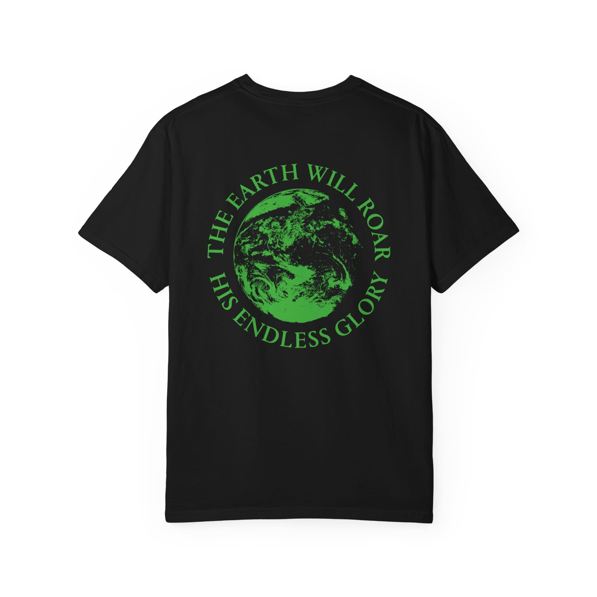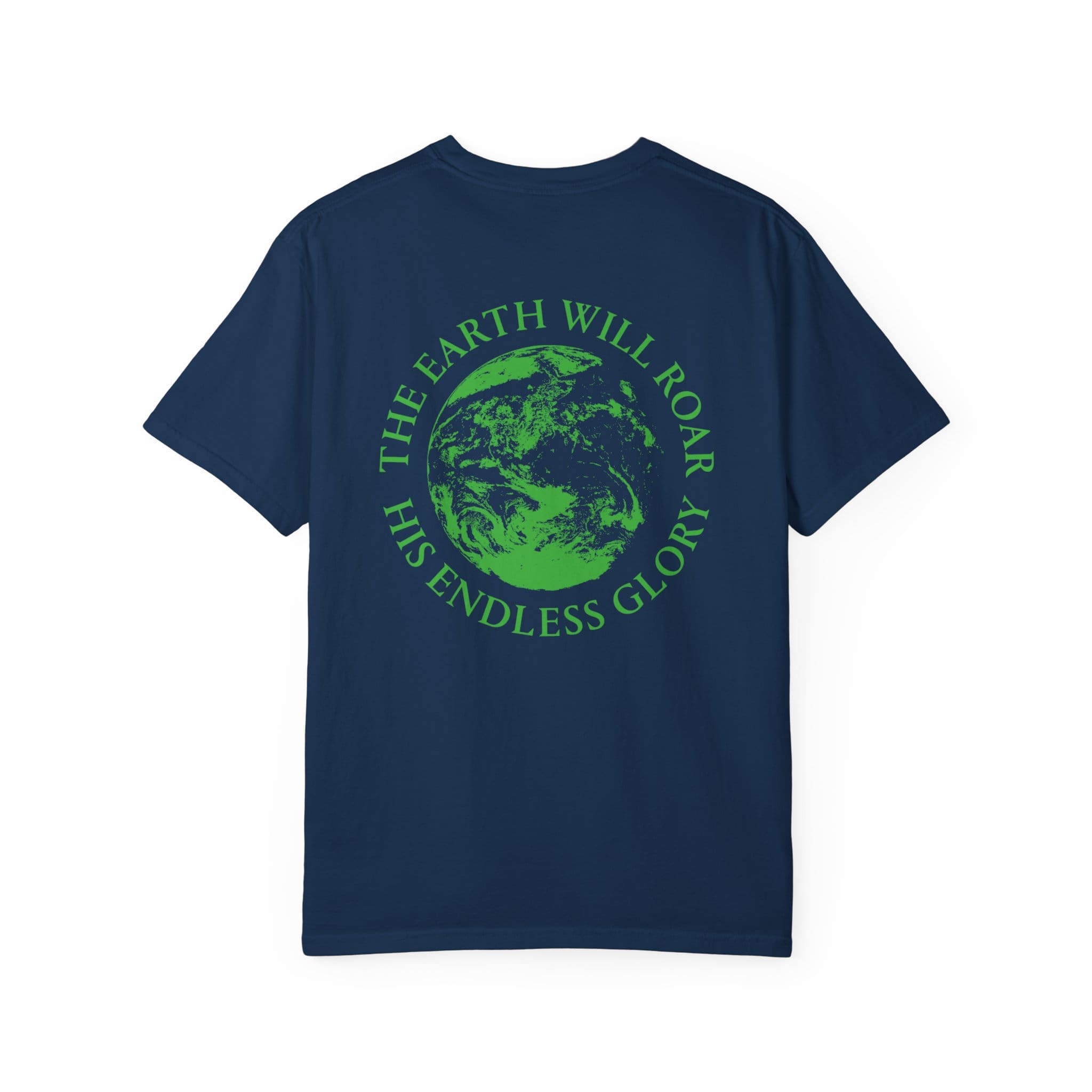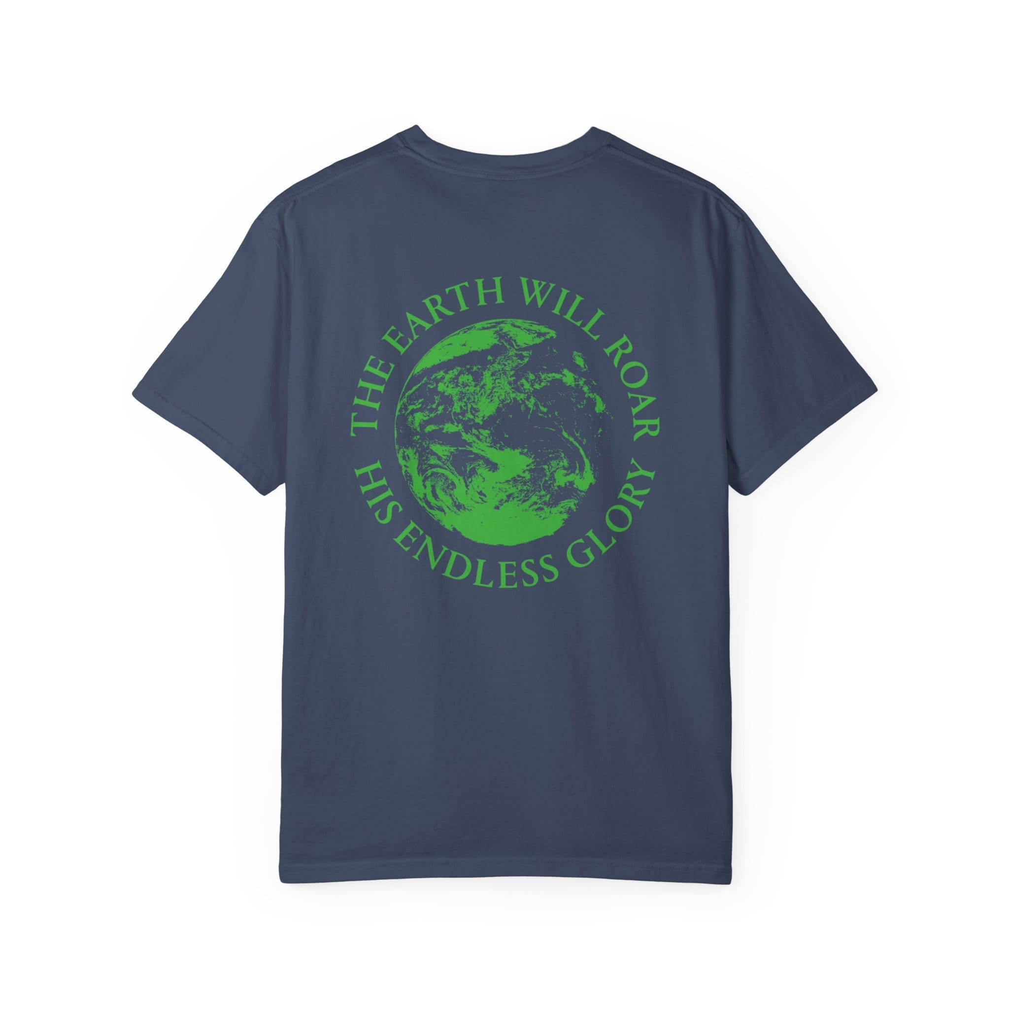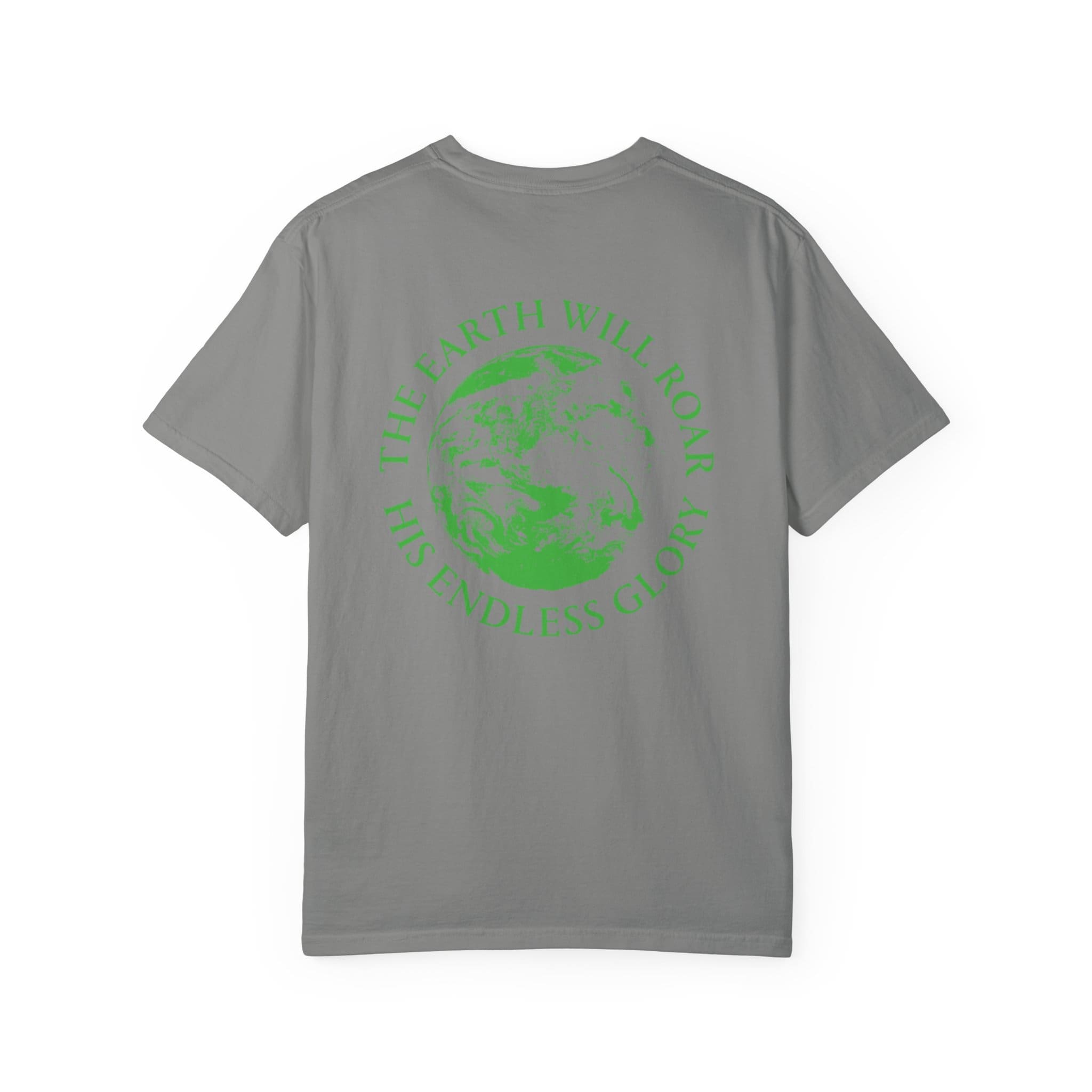 This heavyweight garment-dyed tee brings quiet confidence to everyday wear. The soft, lived-in color and relaxed cut make it feel like an old favorite from the first wear, while the back art — a vivid green Earth with the words “THE EARTH WILL ROAR / HIS ENDLESS GLORY” — gives it a thoughtful, reverent edge. Subtle chest text keeps the design grounded and wearable. It layers easily over hoodies or under jackets, and the durable construction means it stands up to frequent wear without losing its soft hand. Meant for people who want clothing that speaks to faith, creation, and authenticity without shouting.